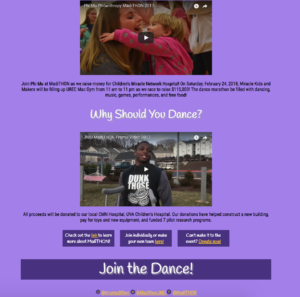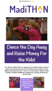 For the same coding and interactive design class, we were able to choose a cause that we wanted to advertise and raise awareness. Being heavily involved in MadiTHON and on the executive board I could not think of anything that would be better. The first screenshot is a coded website that went out for our cause and the second is the browser the email takes you to. Again, these are personally coded and has a responsive web design.