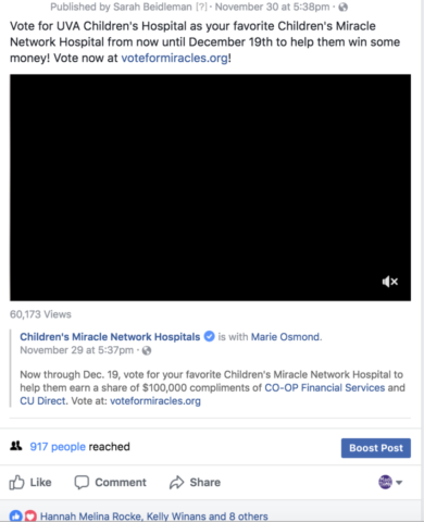 My second year on MadiTHON Exec, I was chosen as the Digital Marketing Head. This meant I was in charge of a committee and all the social media accounts, website, and emails. I managed event marketing, led social media efforts, and wrote social media content and email campaigns, created the brand image, designed graphics including cover photos, flyers, and geofilters. We achieved our goal of recruiting over 800 participants and raising over $115,000 for UVA Children’s Hospital.