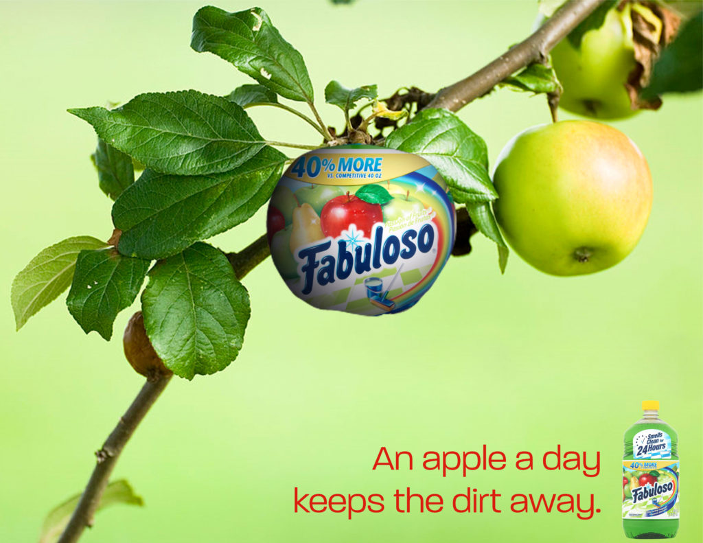 This print ad would be part of a larger campaign using Fabuloso’s other products and placing them in nature. We came up with the idea together and worked on it together. I did the background, picture editing, and text. My partner, Emmie, did the softening, lighting, and highlighting of the Fabulous apple and bottle.